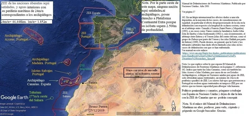 PD. Por seguridad, el día 18/09/2022, envié un correo electrónico a Naciones Unidas DOALOS, preguntadores si Canarias posee o no derechos de Zona Económica Exclusiva de 200m/n y a Plataforma Continental Extra de 150m/n. Me respondieron con un enlace cual dice que España presentó en mayo del 2009 un Estudio Oceanográfico donde ante Naciones Unidas reclama a partir de las islas El Hierro y La Palma hacia el oeste, Zona Económica Exclusiva de 200m/n y Plataforma continental Extra de 150m/n. Pero no expone nada sobre las aguas marítimas con las que Canarias encara hacia el este con las costas marroquíes y saharauis. Por lo dicho las aguas marítimas de nuestro archipiélago están en el limbo, lo que justifica que he tenido y tengo razón en todo cuanto he venido abogando y aún abogo sobre que Canarias es huérfana hasta el presente de aguas marítimas.