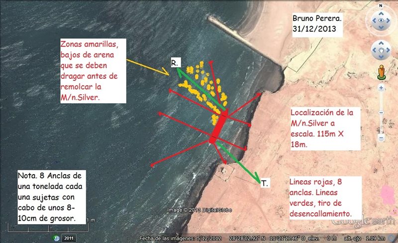 Estimado señor Embajador; saludos cordiales y próspero Año Nuevo, para usted y su nación. De la experiencia que tengo de labores petrolíferas y de varios encallamientos donde participé en los rescates que se llevaron a cabo hace algunos años en cercanías de la Isla del Carmen e islotes Callos Arcas, Campeche Méjico; siento preocupación pensando en que si no se hace bien la maniobra del vaciado de los tanques y el desencallamiento de la M/n. Silver, se podría dar lugar a un gran desastre ecológico. Por ello me tomo el permiso de mi parte para aconsejar lo siguiente a quienes están haciendo dichos trabajos.