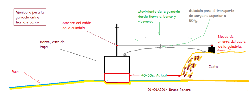 (11)Pienso que para transportar los utensilios que no pesen más de unos 50 kg, se podrían enviar a bordo y devuelta a tierra, viceversa, por medio de un cable que se extienda entre el barco y la costa. Este cable funcionaría con una guindola que sería movida igual que las que se utilizan para pasar mercancías o personas en cruces de ríos africanos, asiáticos y sur americanos, etc.