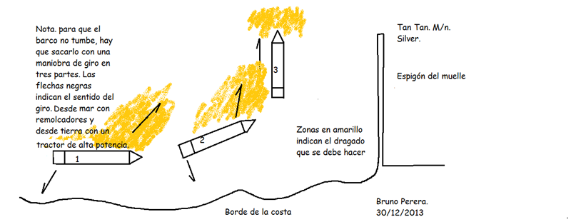 (5)En caso que no se llevara a cabo la maniobra que aconsejo, el barco podría con la marejada que le da por el costado de Babor acercarse unos metros más a la costa, y entonces la maniobra de reflotación se haría mucho más difícil porque el barco quedaría casi en seco.