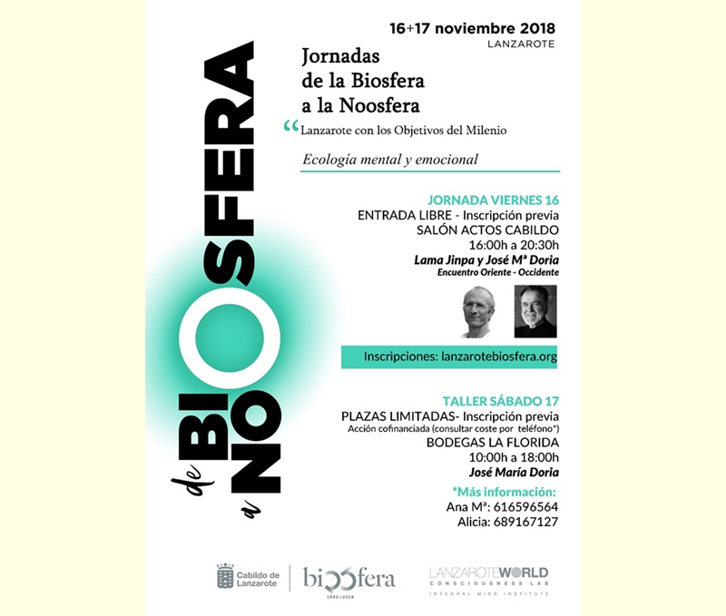 Lanzarote se prepara para acoger las jornadas “De la Biosfera a la Noosfera. Lanzarote con los Objetivos del Milenio” el próximo 16 y 17 de noviembre en el salón de actos del Cabildo de Lanzarote y en las bodegas La Florida. Un evento, capitaneado por los maestros de la conciencia, José María Doria y el Lama Jinpa Gyamtso (Ángel Vidal), y coorganizado por la coach Gloria Artiles.