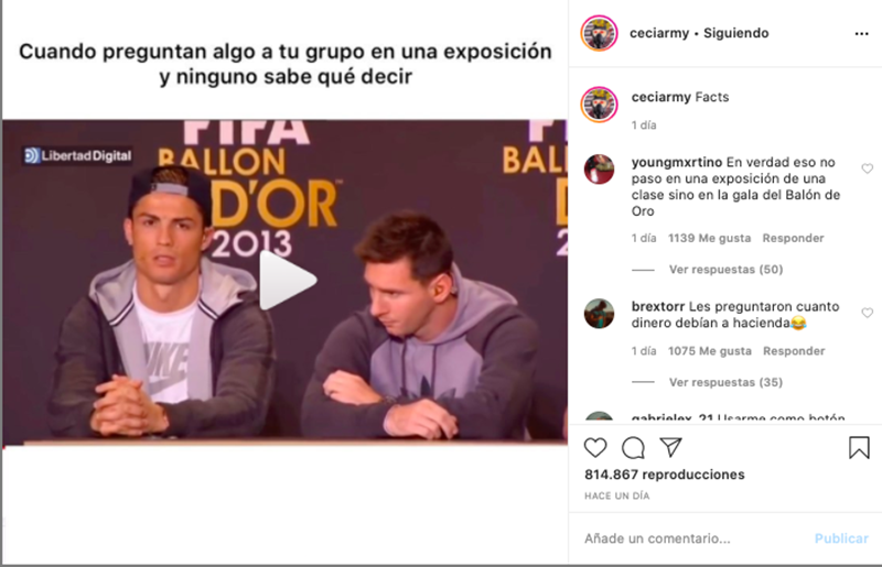 Según ha comentado Ceciarmy en una reciente entrevista realizada en el periódico NoticiasVigo, uno de sus objetivos es convertir en carcajada un día aburrido y normal, tal cual ha realizado en su última publicación. En ausencia absoluta de noticias de fútbol, ¡que mejor que recordar una divertida escena ocurrida con Messi y CR7 años atrás! para traerla nuevamente a nuestras mentes, relacionándola con el día a día de su comunidad.