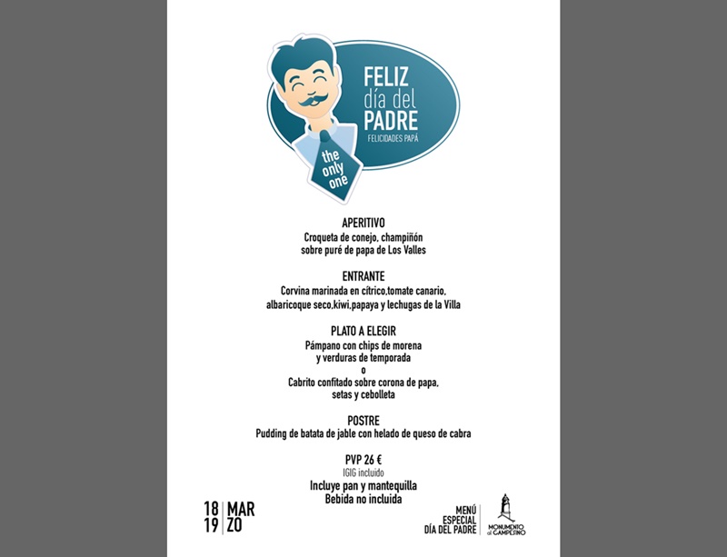 Los Centros de Arte, Cultura y Turismo de Lanzarote proponen una oferta especial para celebrar de una manera especial este fin de semana el Día del Padre. Por este motivo, se ha preparado un menú especial para degustarlo en el Monumento del Campesino los días 18 y 19 de marzo. Esta propuesta gastronómica tiene un coste de 26 euros y consta de platos tan deliciosos como croquetas de conejo, corvina marinada, pámpano con chips de morena o cabrito confitado entre otras muchas delicias. Además desde los Cacts se ha programado una serie de propuestas muy especiales para el domingo 18, como un taller para hacer pellas de gofio o el lunes 19 para hacer salsas canarias.