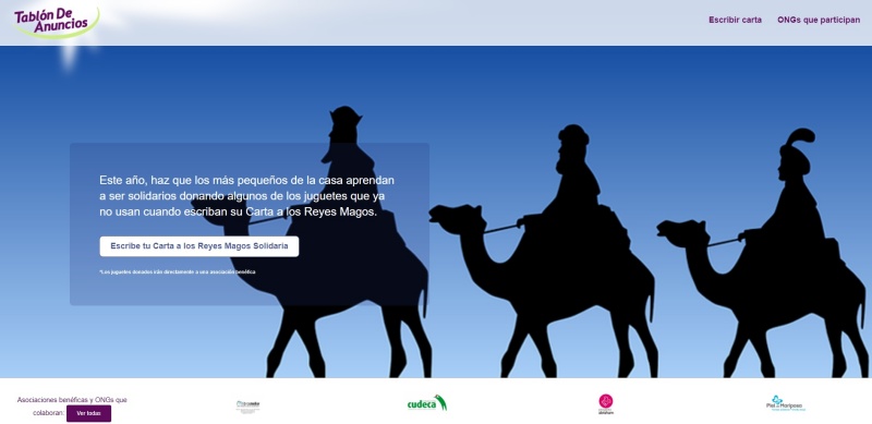 La aplicación web “Carta Solidaria a los Reyes Magos”, creada por el portal de anuncios Tablondeanuncios.com, es innovadora, totalmente gratuita y permite a los niños que a la hora de hacer la carta a los Reyes Magos puedan incluir una relación de los juguetes usados que quieren donar para que otros niños tengan su regalo de Reyes.