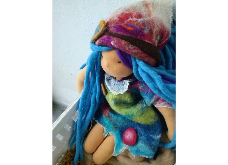 Tiene muñecas decorativas para adultos, de pequeño tamaño, de gran tamaño y muñecas pensadas directamente para los más pequeños de la casa. “Para hacer las muñecas realizo las piezas directamente modelándolas con las agujas mientras les doy forma”, explica. “Las grandes las hago cosiéndolas y llevan también algodón. Mi toque diferente, a las Waldorf de siempre, es que les hago el pelo con lana, hago rastas de colores para las melenas de mis muñecas que son de todas las etnias”, asegura.