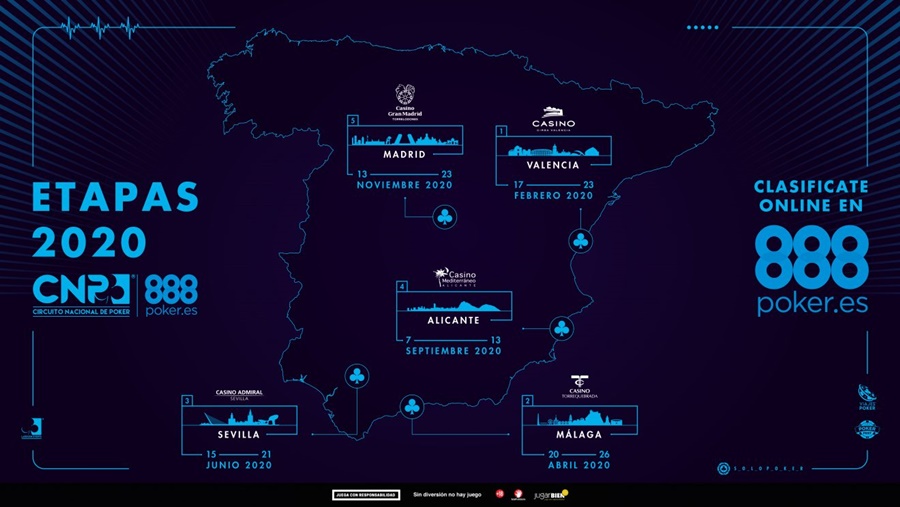 El Circuito Nacional de Póker (CNP), por su parte, sí ha incluido modificaciones en las sedes de sus torneos, aunque ninguna contempla la visita al archipiélago canario. Patrocinado por el operador 888, que tiene una amplia visibilidad en nuestro país a través del casino de 888 en su versión online y de su oferta de juego también a través de internet, el CNP contará en su novena edición con un total de cinco paradas, dos menos que el CEP. La competición arrancó el pasado 17 de febrero en Valencia, escenario del pistoletazo de salida de sus últimas ediciones. Tras su paso por la ciudad del Turia, el CNP visitará Málaga del 20 al 26 de abril en su segunda parada, mientras que la tercera tendrá lugar en Sevilla de 15 al 21 de junio. La cita en tierras hispalenses es la gran novedad de la edición de este 2020, ya que pasa a sustituir a la parada habitual que el torneo hacía en Bilbao. La Comunidad Valenciana, al igual que Andalucía, también hace doblete en esta programación al convertirse Alicante en la sede de la cuarta etapa, que se desarrollará del 7 al 13 de septiembre. Por último, el broche de oro de la competición tendrá lugar en Madrid, del 16 al 23 de noviembre.