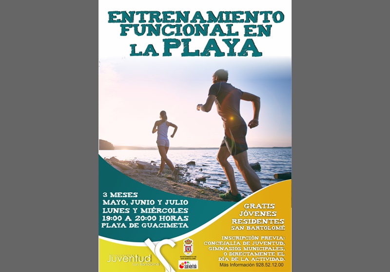 La concejalía de juventud del Ayuntamiento de San Bartolomé, delegada en Isabel Sosa, informa que dentro de la programación anual que ofrece la concejalía y que incluye gran variedad de actividades de ocio, tiempo libre, lúdicas, culturales y deportivas para la juventud, en el mes de mayo organiza clases de “Entrenamiento Funcional” en la playa de Guacimeta, que se prolongarán los meses de junio y julio, los lunes y miércoles de 19.00 a 20.00 horas, teniendo como objetivo crear espacios de encuentro y ocio saludable entre jóvenes.