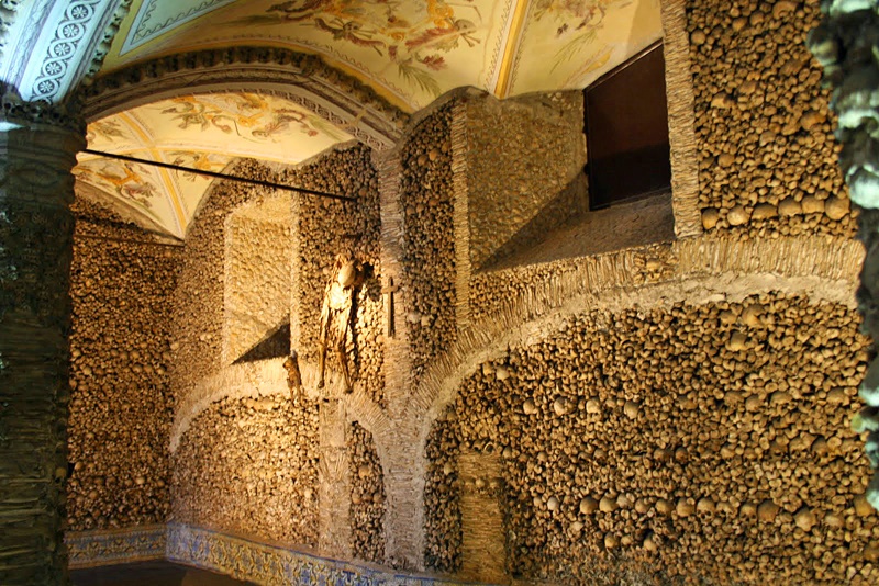 Capela dos ossos. Un impresionante monumento que no dejará a nadie indiferente. La Capilla de los Huesos de Évora es una capilla lateral de la iglesia de San Francisco y recibe su nombre porque todos sus muros de sus tres pequeñas salas están cubiertos de calaveras y huesos humanos, como imagen de lo efímera que es la existencia terrenal. Su construcción data del siglo XVI. La capilla tiene un acceso lateral por un patio de la iglesia y hay que pagar entrada para contemplarla.
