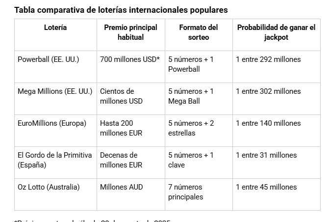 La EuroMillions es popular en Europa y a veces supera los 200 millones de euros. Otros ejemplos incluyen El Gordo de la Primitiva en España y Oz Lotto en Australia. Lo interesante de estas loterías es el tamaño del premio y la emoción de esperar los sorteos, que suelen ser cada semana.