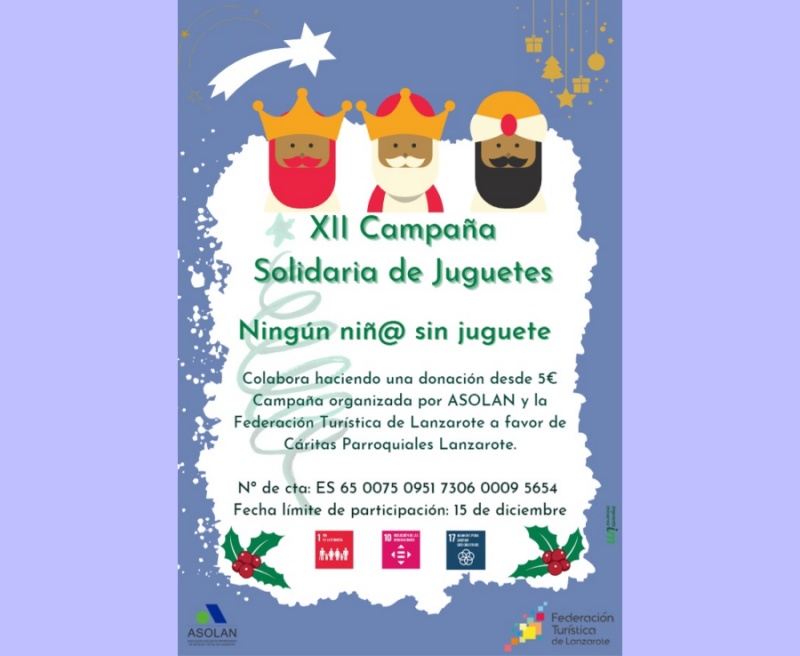 Se trata de una nueva edición de la tradicional campaña "Ningún niñ@ sin juguete", cuyo objetivo es recaudar fondos para comprar juguetes y entregarlos a través de Cáritas Parroquiales a los niños y niñas con menos recursos de Lanzarote para que puedan disfrutar de su merecido regalo estas Navidades.