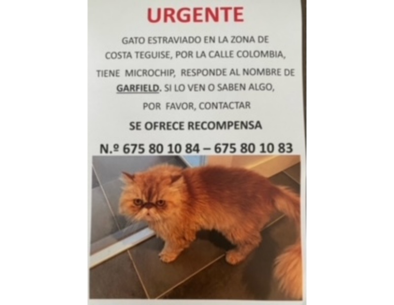 Si han visto a Garfiel o tienen alguna información sobre él, por favor pónganse en contacto con la familia, llamando al 675801084.