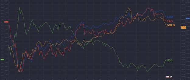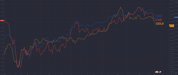 Una correlación notable desde que la pandemia golpeó por primera vez es el hecho de que el oro (XAU), el dólar australiano (AUD) y el dólar canadiense (CAD) se han negociado casi a la par.