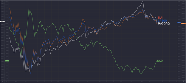 Los mercados se encuentran en un momento crucial, donde se debe tomar una decisión. Y muy bien podría depender de otra decisión que se cierne sobre el mercado. Las próximas elecciones en Estados Unidos son un riesgo de incertidumbre que afectará directamente a la moneda del país, el dólar y sacudirá los principales índices bursátiles estadounidenses. Los índices bursátiles estadounidenses como el S&P 500, NDX y Dow Jones también muestran sorprendentemente una fuerte correlación inversa desde el Jueves Negro, de manera similar a otros ejemplos que hemos mostrado.