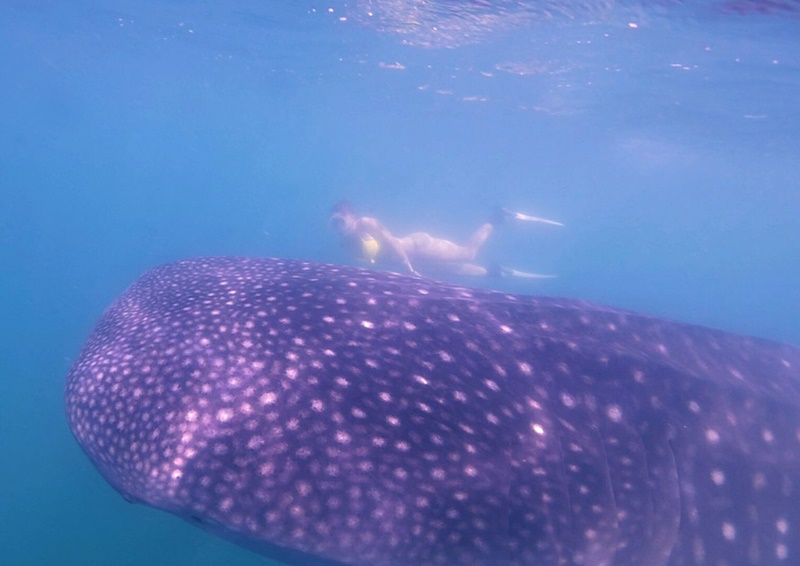 La foto habla por sí misma. En la inmensidad del impresionante océano mexicano una joven bucea entre ballenas.