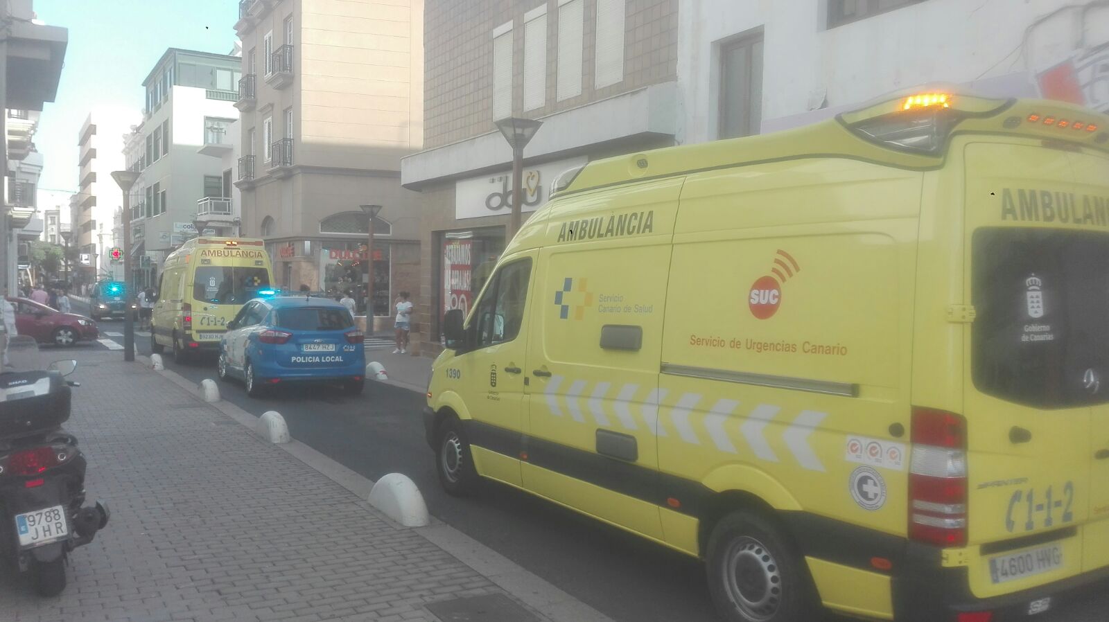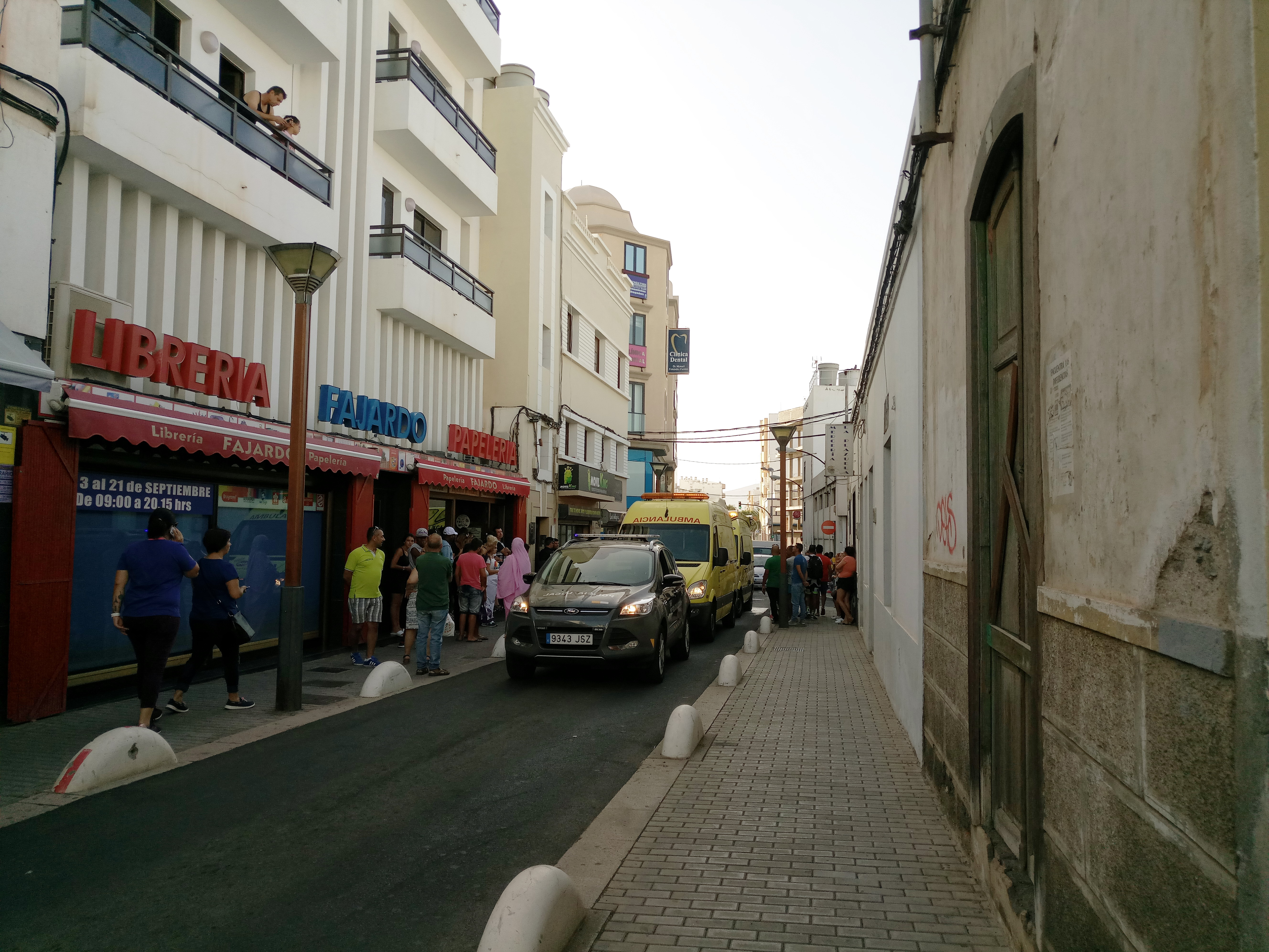 Pasadas las seis de la tarde de este martes los vecinos del centro de Arrecife se han visto sorprendidos al encontrarse con la calle Fajardo cerrada al tráfico por la presencia de tres ambulancias y tres furgones del Cuerpo Nacional de Policía.