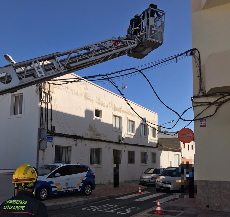 "Con ayuda de la auto escalera procedimos a sujetar mediante bridas de plástico los cables en su enganche dejando la calle operativa", informa el Consorcio de Seguridad y Emergencias del Cabildo.