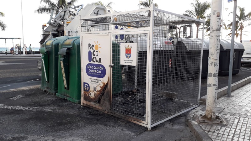 Tras un parón en la quema de contenedores, provocada o por descuidos, este mediodía ardía un nuevo depósito de reciclaje de papel y cartón en la Avenida de Arrecife, frente al Arrecife Gran Hotel.