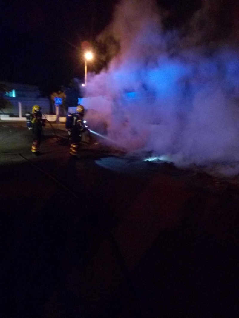 Los Bomberos actuaban en la madrugada del martes 17 de mayo para sofocar el incendio producido en un vehículo ubicado en la esquina entre la Calle La Inés y la Calle Fajardo Ferrer, en Arrecife.