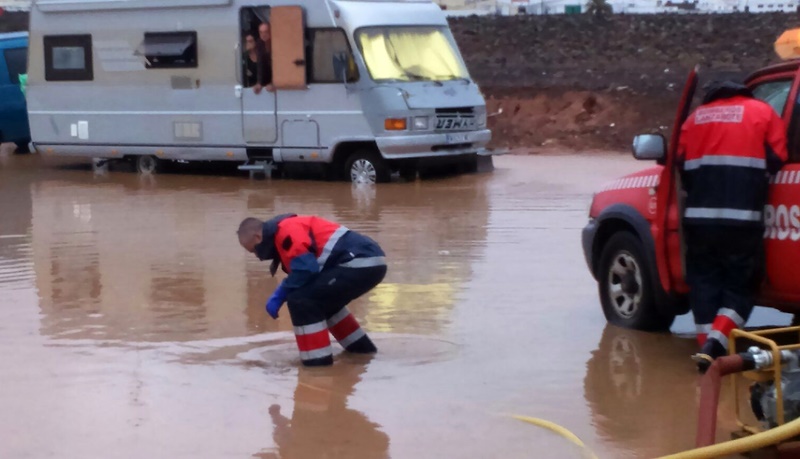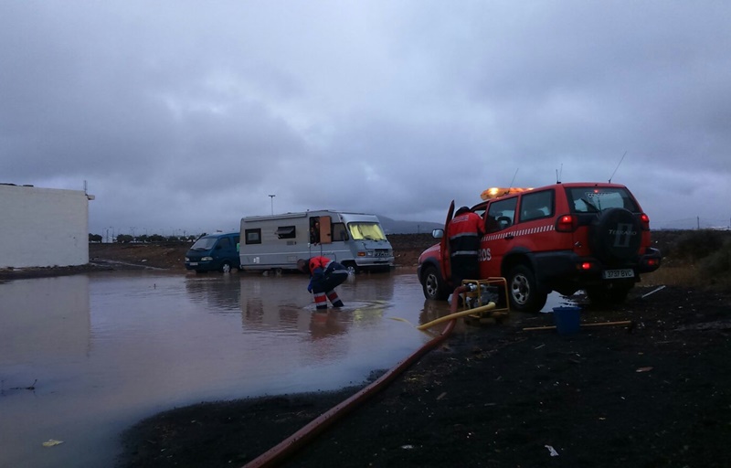 Atrapados por la lluvia. Así amaneció una pareja, instalada en una caravana en la calle Vizcaya de Arrecife. Las intensas precipitaciones caídas durante la madrugada en la capital, donde según el Consorcio de Seguridad y Emergencias llegaron a caer hasta casi de 40 litros por metro cuadrado, formaron un gran charco en el solar donde estaba ubicado el vehículo.