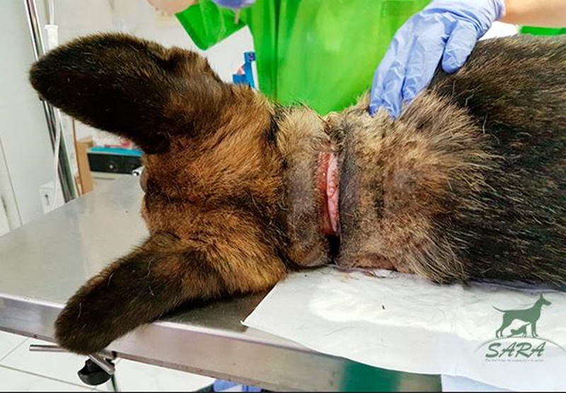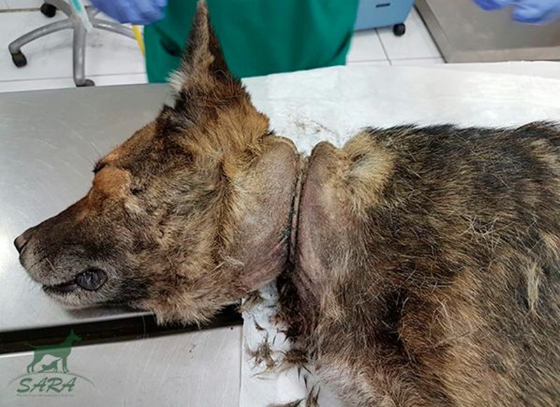 "Una cuerda presionaba y ahorcaba fuertemente a esta perrita, pero esa cuerda no llevaba allí días, ni semanas...su cuerda llevaba presionando su cuello años, causando que su piel y músculo se hundieran de la gran presión de tanto tiempo, provocando una grave infección y la presencia de miasis", afirman desde Sara, desde donde explican que la miasis es una infección por la presencia de larvas de moscas que se alimentan de su tejido. "Es decir, su cuello siendo devorado por gusanos", añaden.