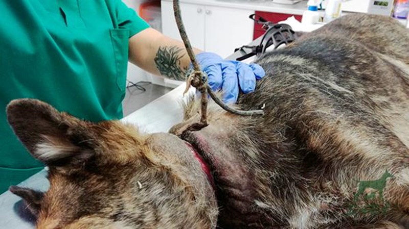 Rubi no sólo presentaba "graves infecciones" por la "maldita cuerda", sino también piometra (infección de útero), "probablemente de haber parido camadas sin control veterinario ninguno", señalan desde Sara, desde donde afirman que el animal no tenía chip.