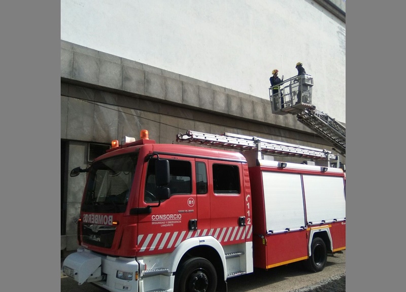 Con la ayuda de una autoescala los efectivos desplazados retiraron doce fluorescentes y elresto de bloques que estaban sueltos en el parapeto de la fachada, dando por finalizado el servicio y regresando a la base.