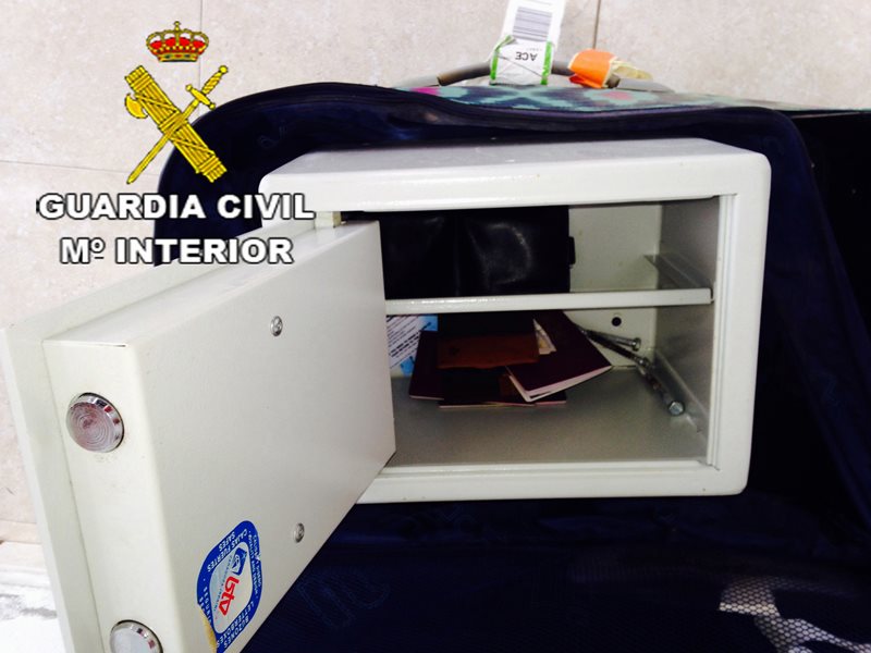 Cerca del lugar descrito se hallaron una maleta semienterrada con una caja fuerte o de seguridad en su interior, y una mochila con varios efectos de ilícita procedencia, como un aparato DVD portátil, dos teléfonos móviles tipo Smartphone, una cámara de fotos, varios relojes, dinero en efectivo, así como documentación que acreditaba la pertenencia de los mismos y los relacionaba con clientes del hotel en cuestión.