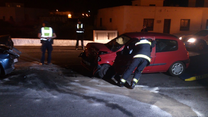 Dos turismos colisionaron frontalmente esta media noche en la vía a La Geria, en el pueblo de Uga, dejando dos heridos leves. Se trata de los conductores de ambos coches, únicos ocupantes de los mismos.