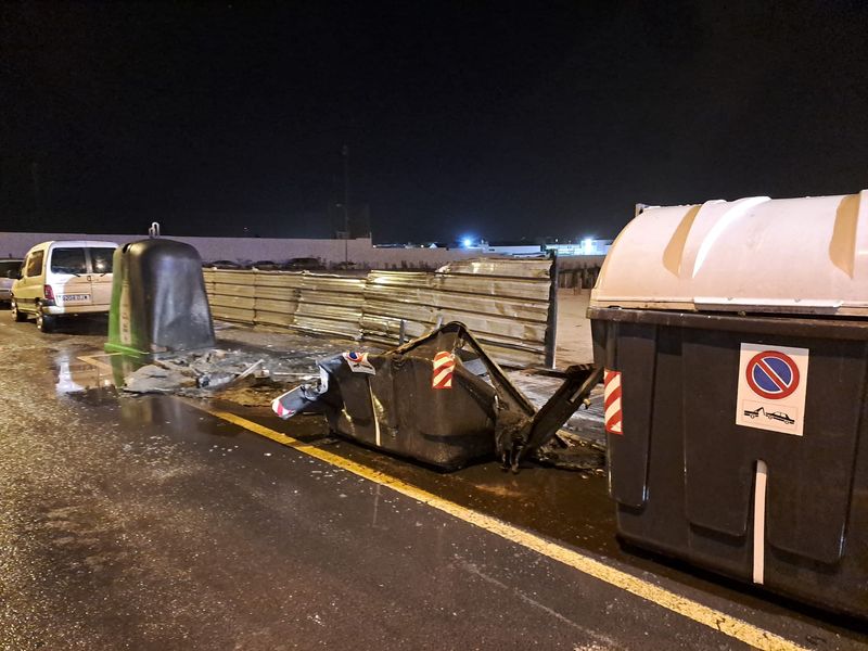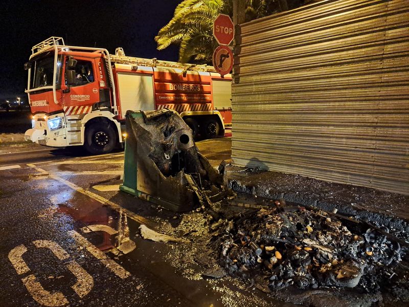 Ya durante la madrugada de este sábado, a las 4:24 horas, los bomberos recibían un nuevo aviso por parte del 1-1-2. Esta vez advertían de que otro incendio se había declarado en la Crispín Corujo del barrio de Argana Alta de Arrecife. Sin embargo,la dirección aportada en principio era errónea y los bomberos corrigieron su ubicación, acudiendo a la calle Aires de Lima, en el mismo barrio capitalino, a la altura del número 109. Allí ardían al menos cinco contenedores, quedando totalmente destruidos 3 de ellos, mientras que los otros dos terminaron parcialmente calcinados pero totalmente inservibles. El fuego además, estaba afectando a tres vehículos cercanos. Los bomberos se emplearon a fondo y con rapidez en las labores de extinción.