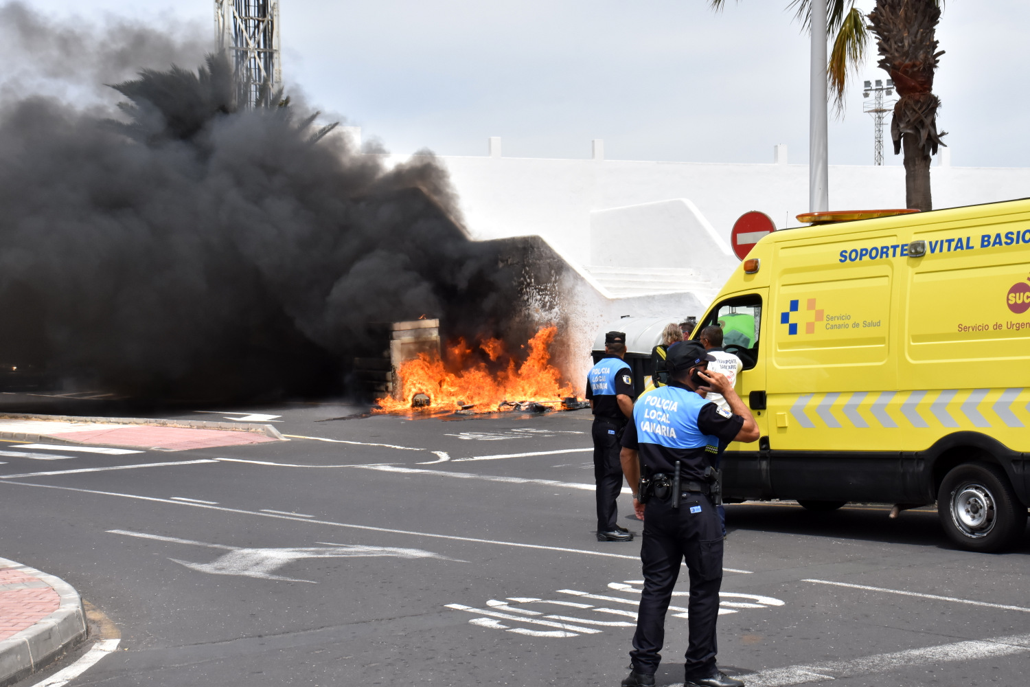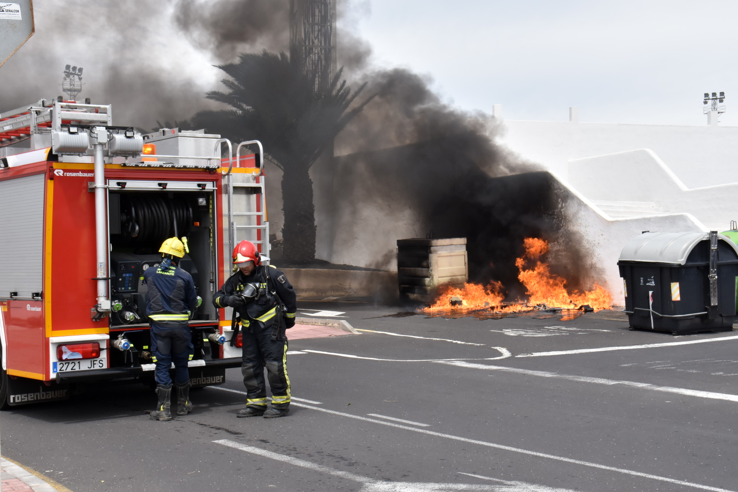 Los bomberos del Consorcio de Seguridad y Emergencias del Cabildo de Lanzarote fueron alertados, este mediodía, de que un contenedor de depósito de plásticos estaba en llamas en la confluencia de las calles Libertad y La Luchada, en el municipio de Tías, en las inmediaciones del Campo de Fútbol Local.