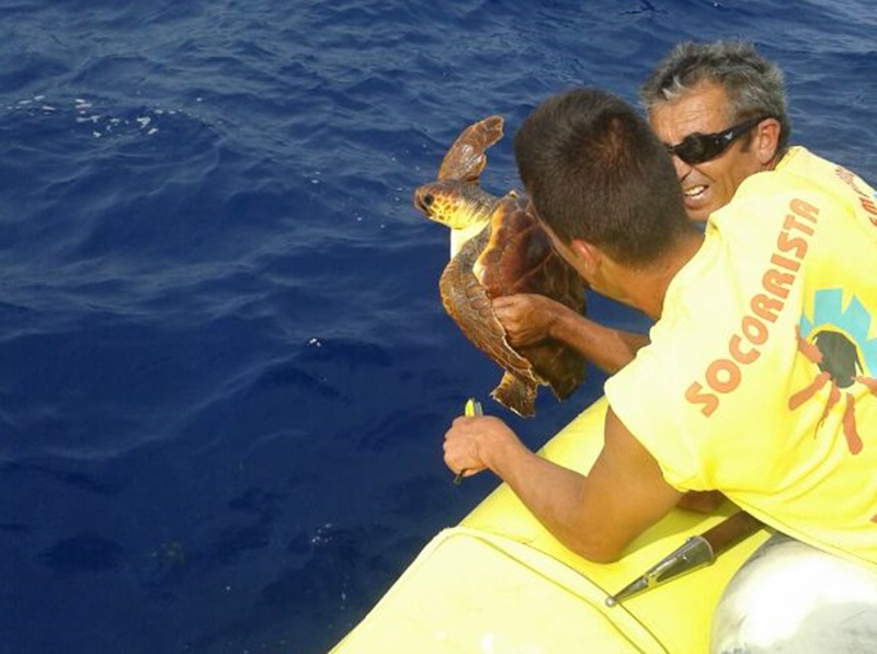 Emerlan rescata a una tortuga que estaba enredada en una red flotando en el mar en Puerto del Carmen
