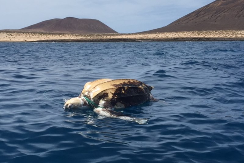 El ejemplar, perteneciente a la familia Dermochelys, se encontraba muerto y presentaba sus aletas y cuello enredados en un cabo, lo que apunta a una posible asfixia.