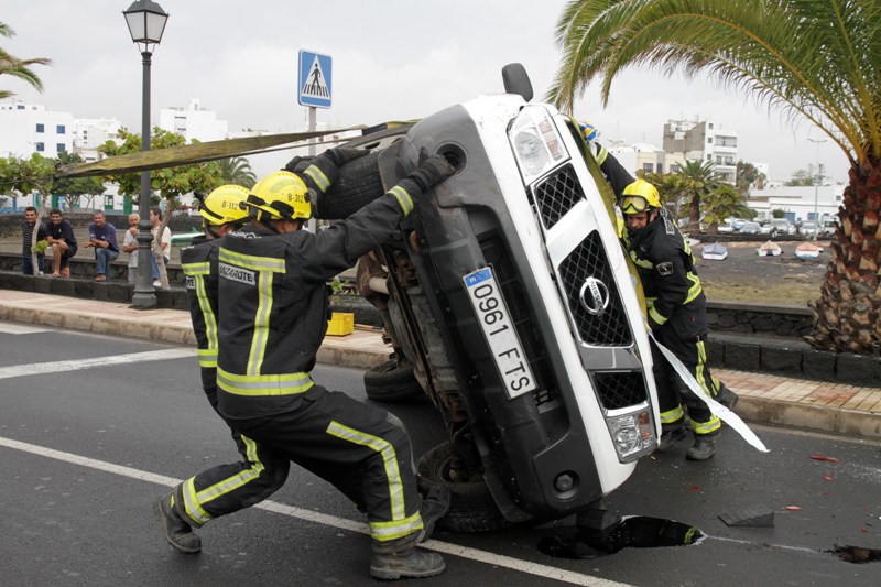 Un vehículo de la Policía Portuaria sufrió en la mañana este miércoles 31 de octubre, hacia las 8:15 horas, un vuelco en las inmediaciones de la zona La Rocar, en Arrecife.