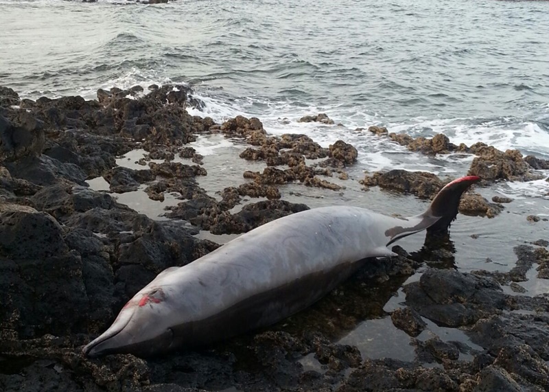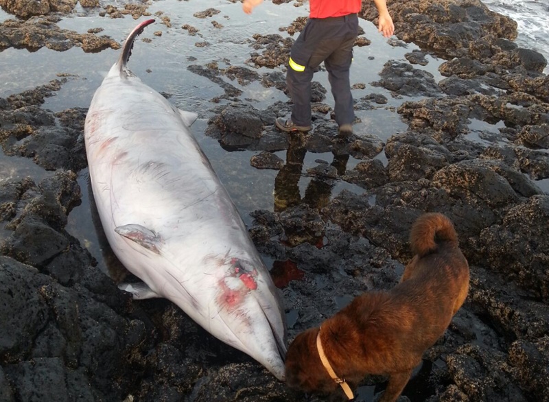 Una hembra de zifio de unos 3,5 metros ha sido hallada en la tarde de este sábado en la costa de Mala. El animal estaba herido y ha acabado falleciendo.