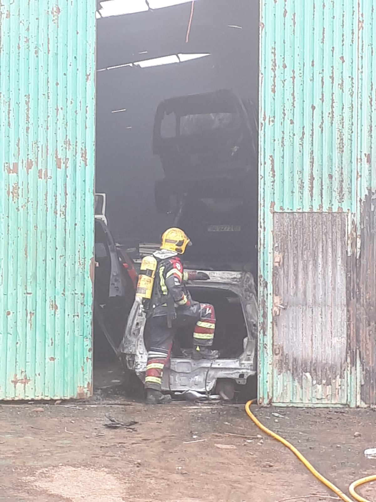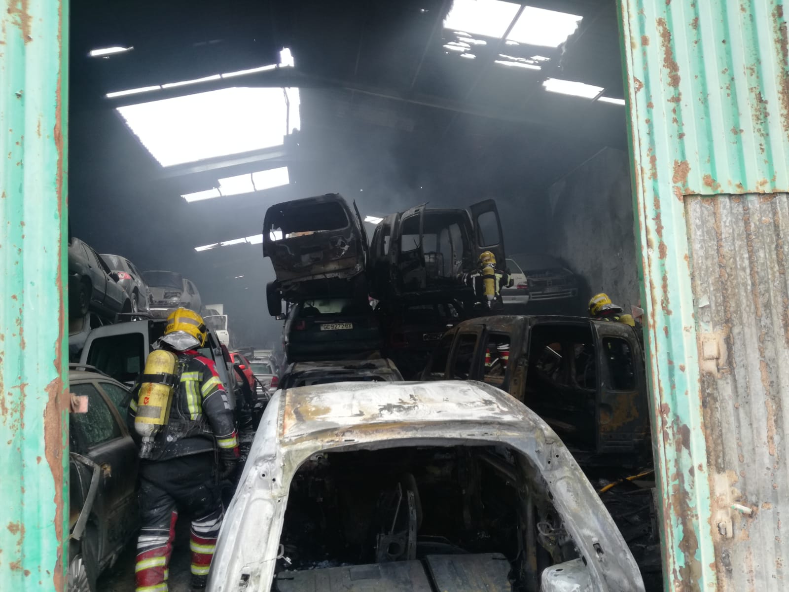 Una unidad de bomberos hubieron de proceder a la apertura de la puerta de la nave con el material de excarcelación mientras la otra procedió a realizar un reconocimiento perimetral observando que la nave da para dos calles. Esta circunstancia fue aprovechada para abrir la puerta trasera para favorecer la ventilación, observando entonces na gran cantidad de coches apilados.