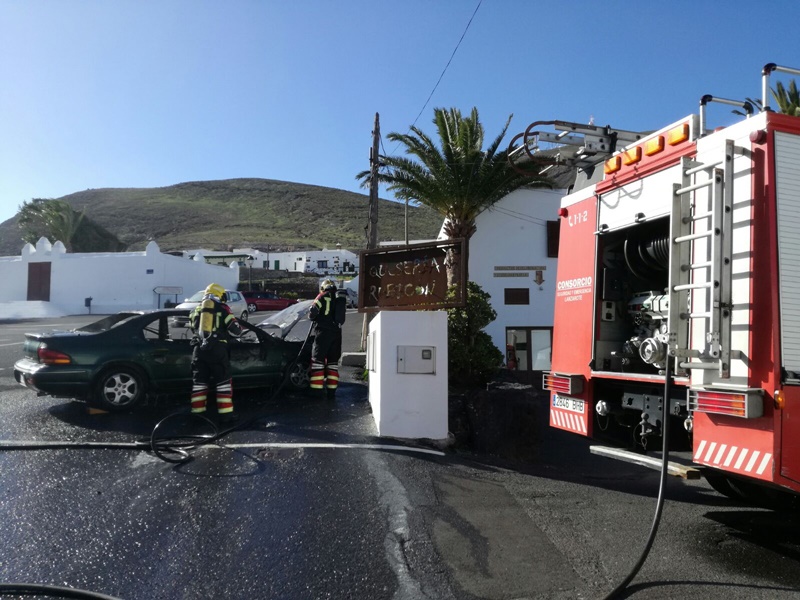 Los Bomberos apagaban hacia las 19:27 de este lunes el incendio producido en un vehículo ubicado en la Avenida del Rubicón de Femés.