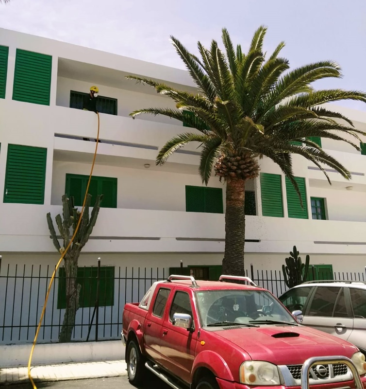 Los bomberos también apagaron en la tarde de este martes un pequeño conato de incendio en la copa de una palmera. Alertados por el CECOES, se dirigieron a la calle Chalana en Puerto del Carmen, en el municipio de Tías, ya que se había producido fuego en una palmera.