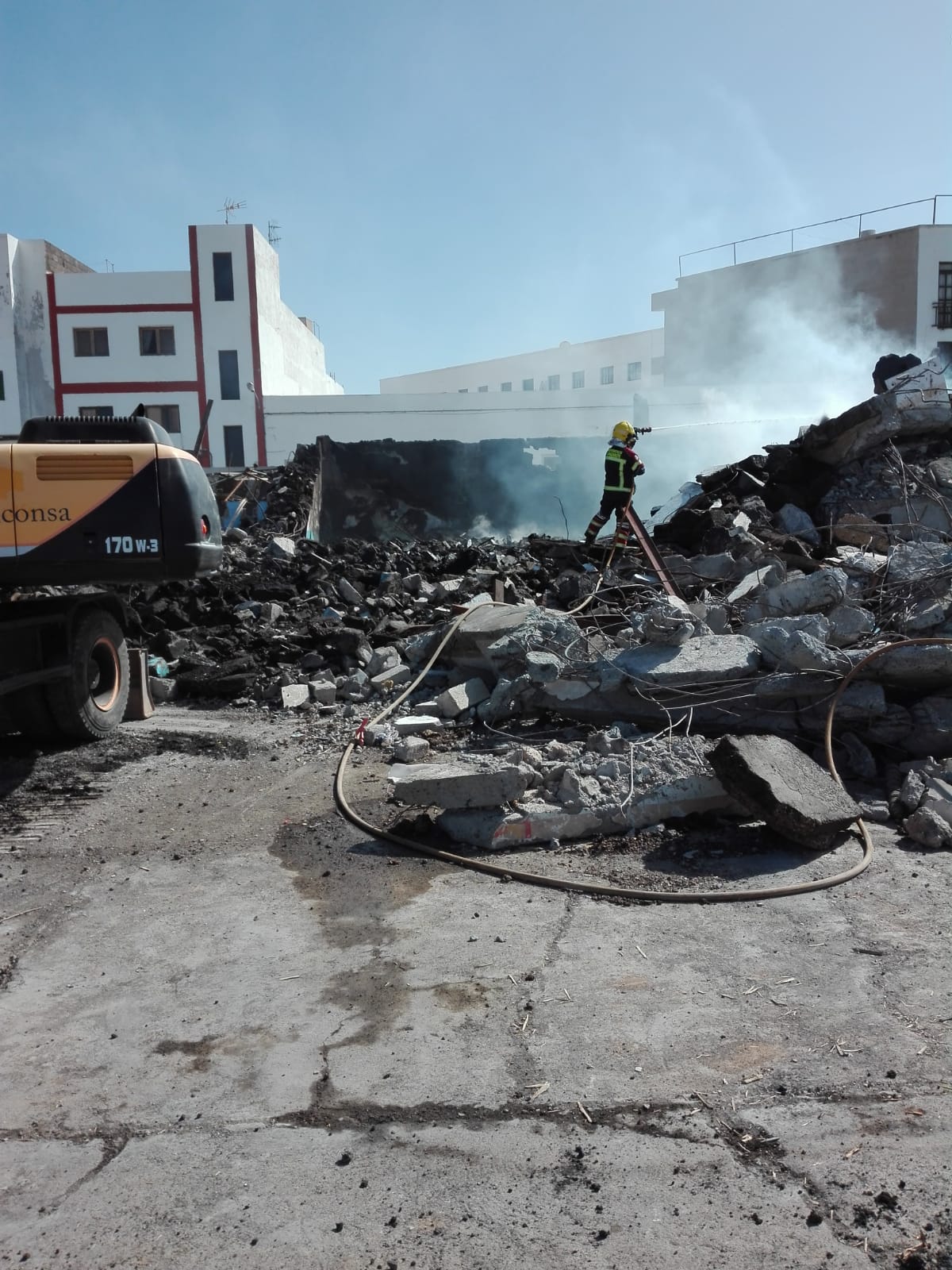 El incendio de unos corchos ente escombros en las inmediaciones de la antigua fábrica de Garavilla, en Arrecife, obligó a una unidad del Cuerpo de Bomberos a acudir al lugar para tratar de sofocar el fuego.
