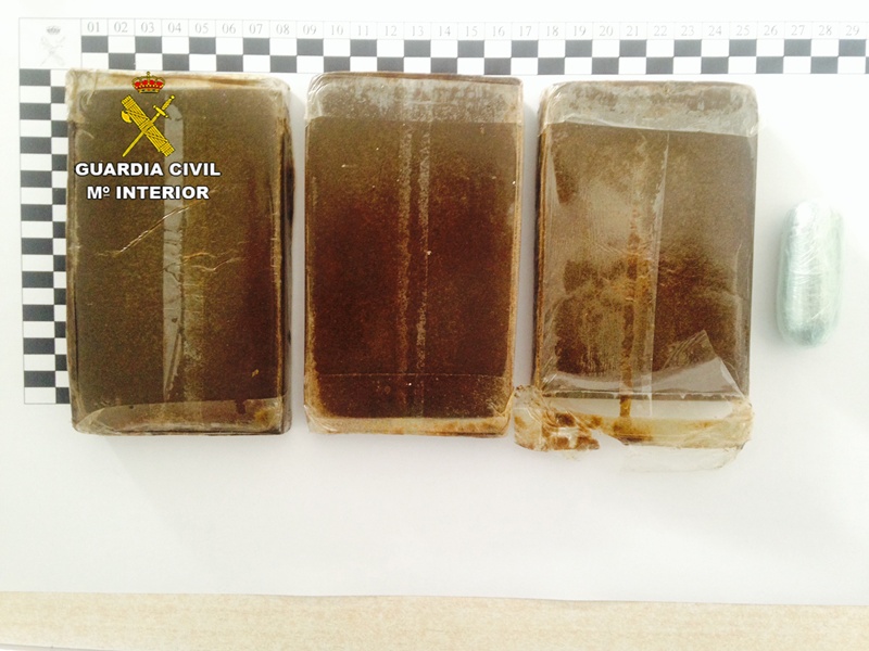 Por este motivo, se realizó un registro superficial en sus pertenencias y se comprobó que en un bolso de su propiedad portaba tres piezas de hachís y una bellota que arrojaban en total un peso de 300 gramos.