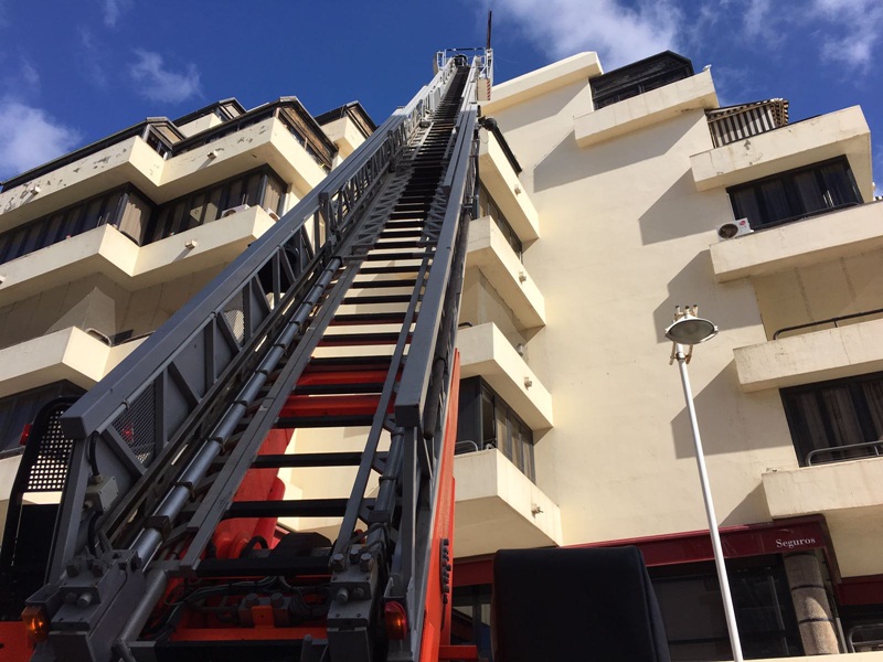Los bomberos del Consorcio de Emergencias de Lanzarote han tenido que desplazarse en la tarde e este viernes hasta la calle Guenia de la capital para asegurar los techos de dos balcones del edificio El Islote, de donde habían caído varios cascotes de madera.