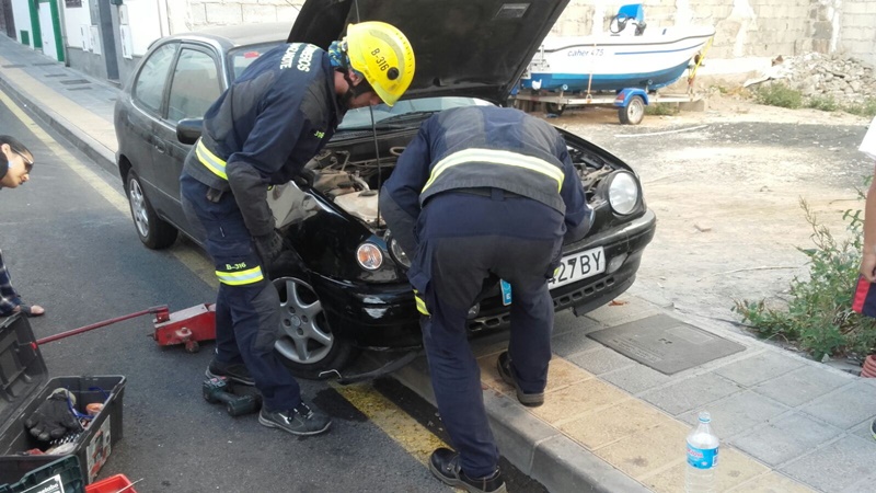 No se encontraba en la copa de un árbol pero fue necesaria la intervención de los bomberos para poder salvarle. Y es que efectivos del Consorcio de Seguridad y Emergencias han rescatado este martes un gato atrapado en el paso de rueda de un coche. El vehículo se encontraba en la calle Pío Baroja de Arrecife y hasta el lugar se han desplazado los bomberos, que una vez en el sitio pudieron comprobar que el pequeño felino se encontraba atrapado en el paso de la rueda, por lo que fue preciso desmontar parte del automóvil y rescatarlo.