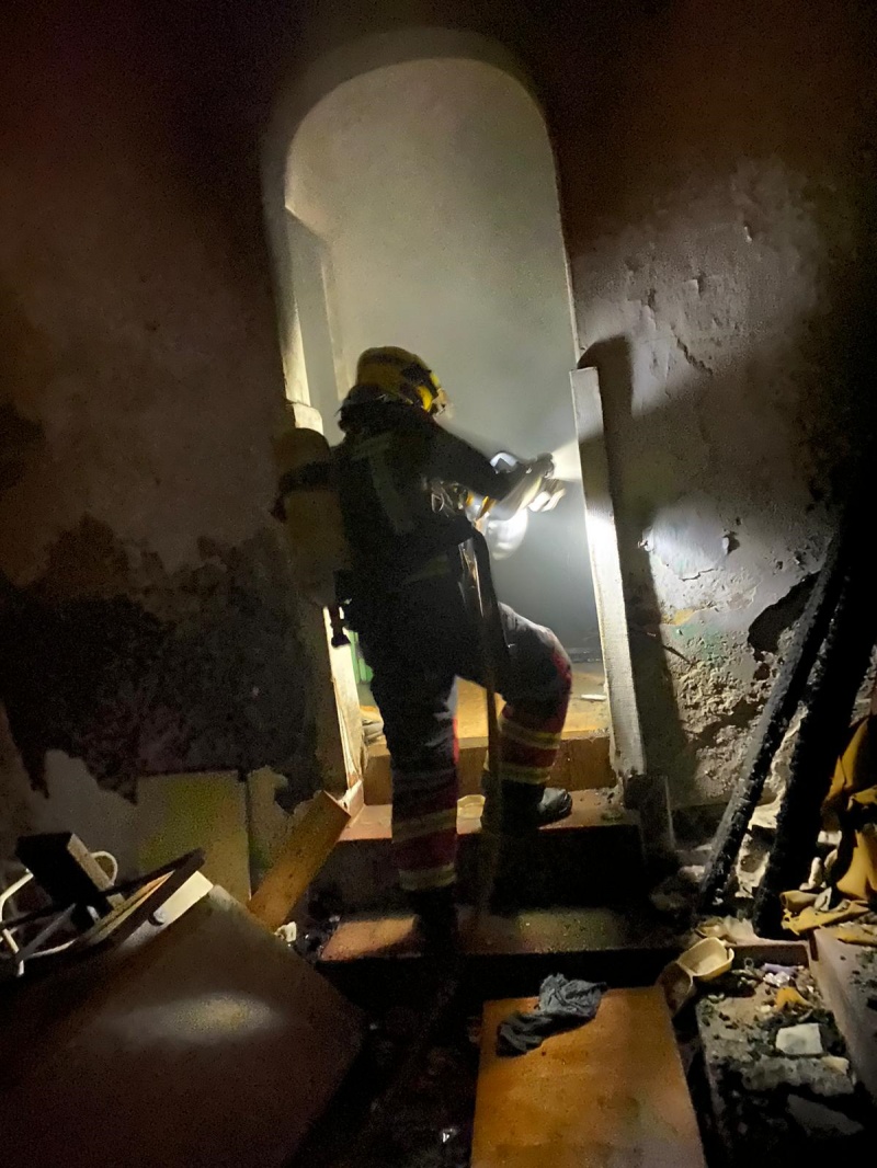 Los Bomberos, debido a la dificultad de acceder a la vivienda, realizaron un pequeño butrón en una de las ventanas con ayuda de un marrón para poder pasar la manguera y la lanza y extinguir el fuego ubicado en una de las habitaciones.