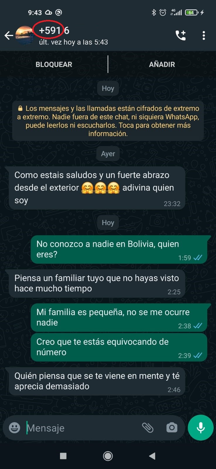 - El teléfono siempre es de un número desconocido por nosotros, y con prefijo internacional, normalmente +591 Bolivia.