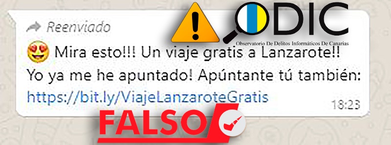 En un comunicado explican la metodología que utilizan los cibercriminales para que muchos usuarios caigan en este engaño: “Los analistas del ODIC detectamos la existencia de mensajes enviados a través de WhatsApp donde el gancho usado para hacer creer que el sorteo es auténtico es atraer con un mensaje atractivo que dice “¡Mira esto! Un viaje gratis a Lanzarote. Yo ya me he apuntado. ¡Apúntate tú también! Una vez llamada la atención de la víctima, éste clica en el enlace existente en el mensaje, redirigiéndolo a un sitio web “falso”, en este caso es el siguiente link http://lanzarotevacaciones.info/, donde debe inscribirse con su nombre completo y la ciudad donde reside la víctima. A continuación, nos redirige a otra página que debemos desbloquearla compartiendo esta promoción fraudulenta con nuestros contactos por WhatsApp. Y, de este modo, al compartir, se hace “viral” la estafa del supuesto sorteo de un viaje gratis a Lanzarote”.