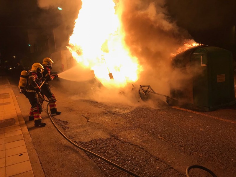 Alertados por el CECOES, los Bomberos tuvieron que salir nuevamente de la central sobre las 04.34 horas a sofocar el incendio que afectó a dos contenedores de residuos orgánicos y uno de vidrio.