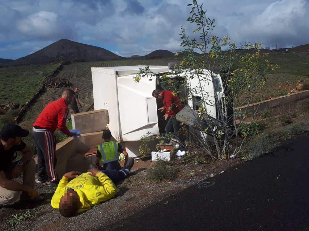 Un furgón de transporte de fruta y verdura, volcaba lateralmente esta mañana de lunes sobre las 12.00 horas en San Bartolomé, a la altura del karting de la carretera a Playa Honda, según confirman testigos a Lancelot Digital.