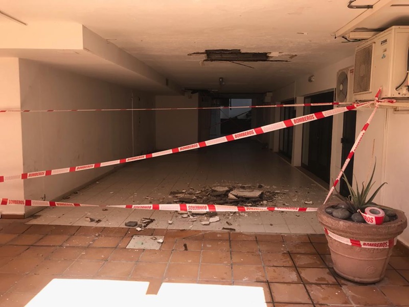 Según informa el Consorcio de Seguridad y Emergencias del Cabildo, "alertados por el CECOES nos dirigimos al servicio. Una vez en el lugar y en presencia de la Policía local y del alertante comprobamos que en la planta menos uno o sótano había habido un desprendimiento del techo de un metro cuadrado dejando ver viguetas oxidadas y parte de las bovedillas, ya que el resto había caído al suelo".