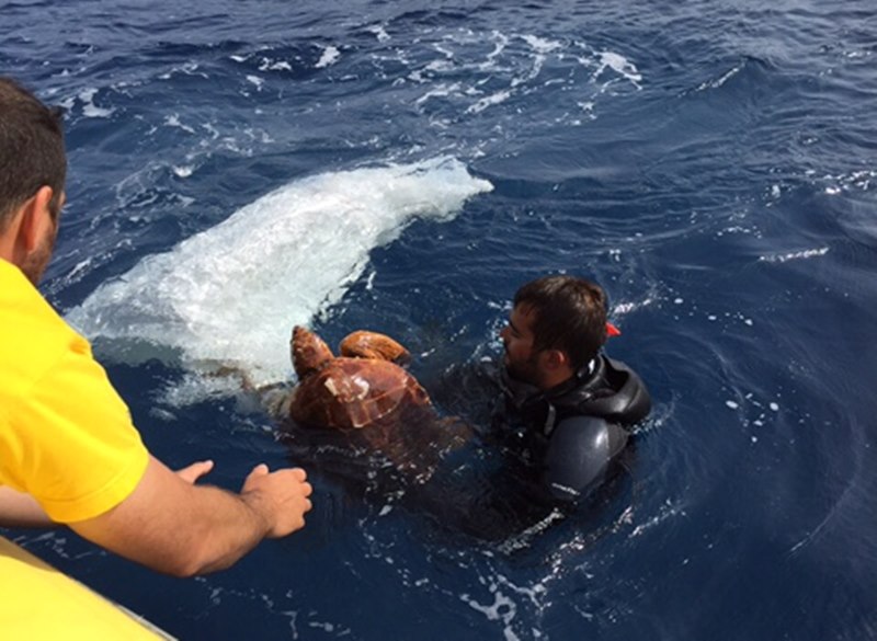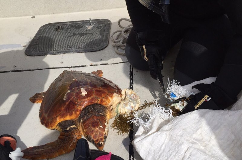 El ejemplar, una tortuga Boba (Caretta Caretta) se había enredado por la aleta delantera izquierda y, de hecho, dicha extremidad se encontraba necrosada debido al enredo con la bolsa.
