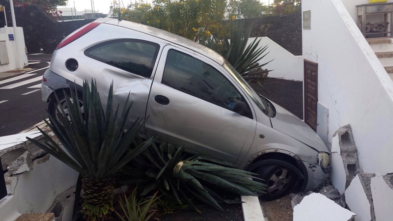 Espectaculares imágenes han llegado a Lancelot Digital de un accidente registrado este lunes en Puerto del Carmen, en las que se ve cómo un coche chocó contra el muro de una vivienda, que se vino abajo.