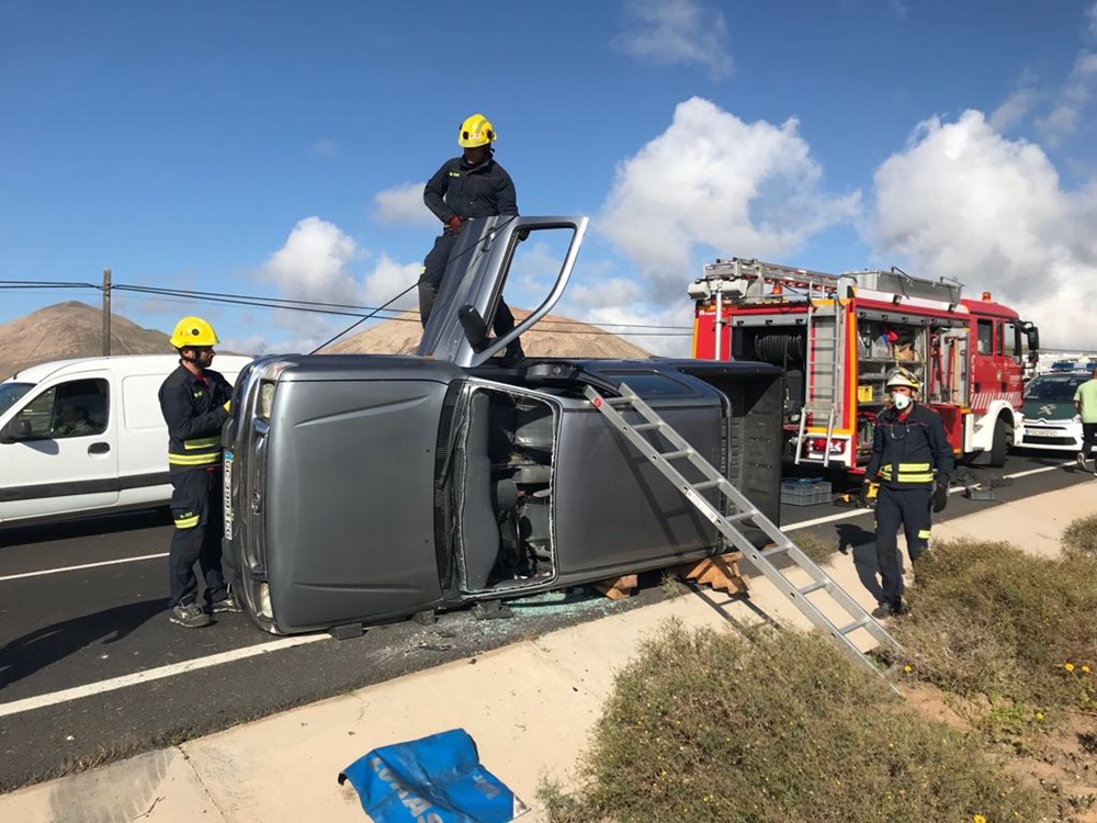 Esta mañana en torno a las 9.45 horas el Consorcio de Seguridad y Emergencias recibía un aviso del CECOES por un vuelco de un vehículo en San Bartolomé. A la llegada de los bomberos al lugar de los hechos se percataron de que los tres ocupantes del coche estaban de pie en el vehículo que había quedado sobre un lateral.